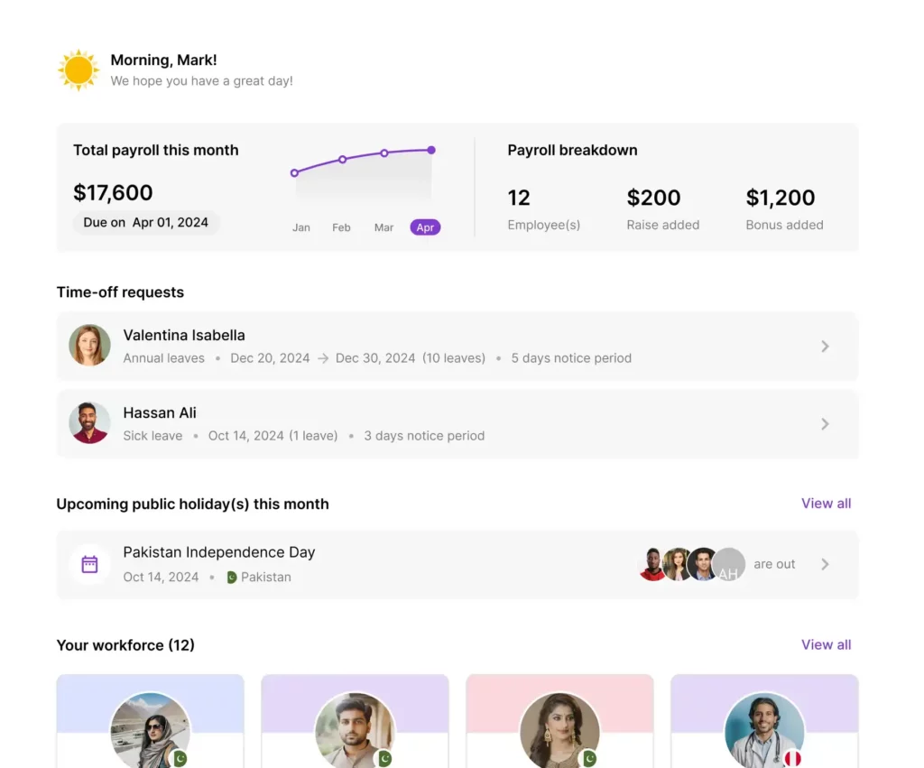 Manage your global team with one simple, intuitive platform — designed to keep work flowing, not slowing.